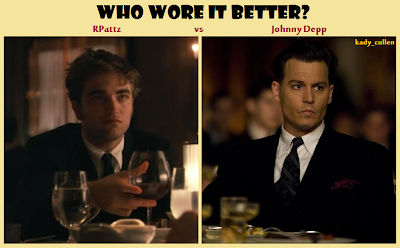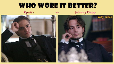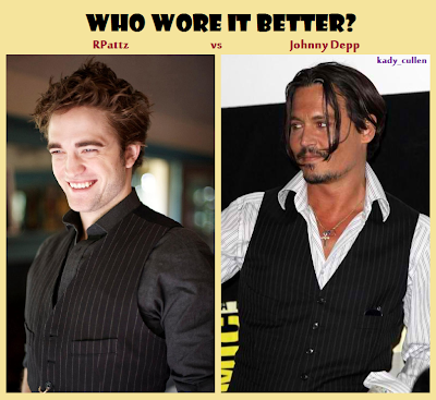 Taková blbůstka. Něco jako otázka Kdo je lepší? Mezi Johnny Deppem a Robem je zbytečná, protože Johnny je pro svět jednoznačně lepší, ale Robert je lepší pro bláznivé fanoušky Twilight. Myslím že Johnny je srdcovka na kterou se jen tak nezapomene, ale Robert je dočasné pobláznění. Já to takhle beru, ale samozdřejmně Roba mám asi radši. Ale tady nejde o to koho máme radši, ale o to že mají to samé na sobě! V celém článku, máte další porovnání. Až se divím kolik toho mněli stejného na sobě!